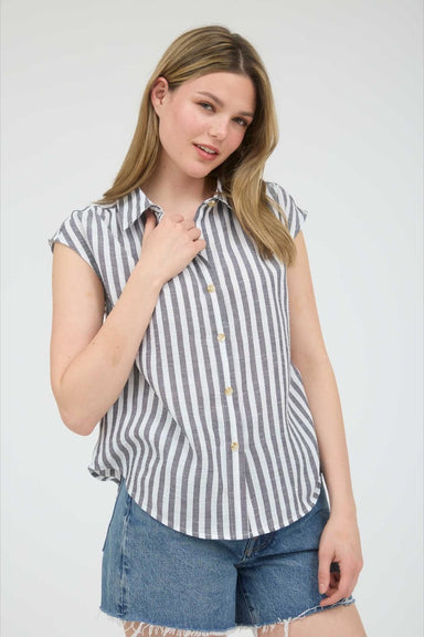 The Allie Striped Top is a lightweight button up shirt featuring short sleeves and a striped pattern. 100% Polyester