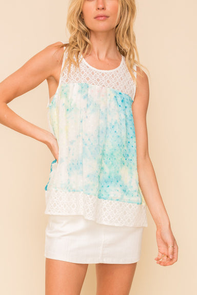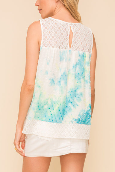 watercolor print swiss dot texture lace panels at top and bottom keyhole back