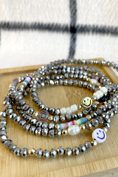 The Rainbow Shell Necklace is a beaded necklace in a colorblock pattern with a sterling silver puka shell charm.
