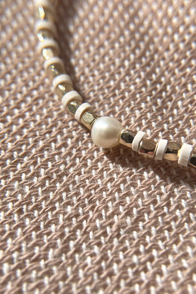 $28.00| /layered necklace pearl and puka shell design length 15" extension 2" 75% Brass 20% Zinc 5% Acrylic Pearl
