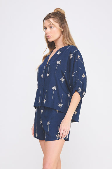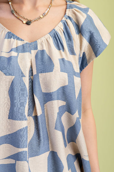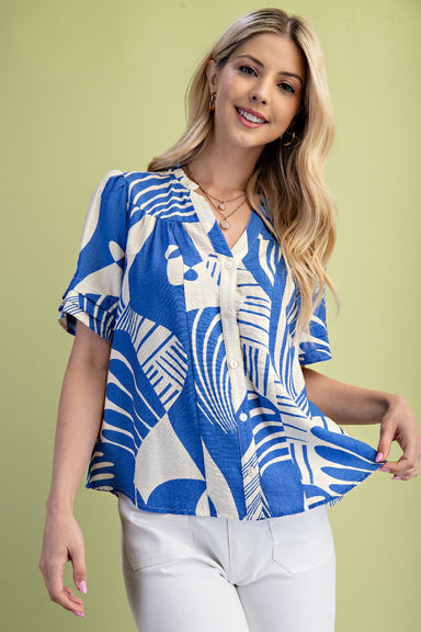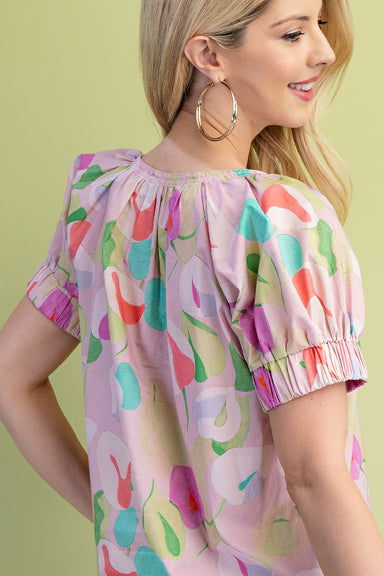 The Mariah Top features a loose fit, split neckline, and puff sleeves in a pop of print.-Self 100% Tencel / Contrast 100% Cotton