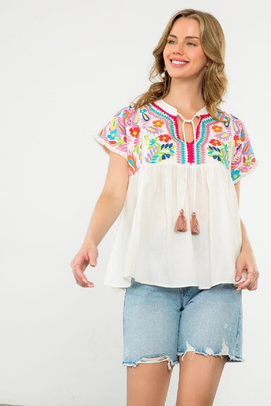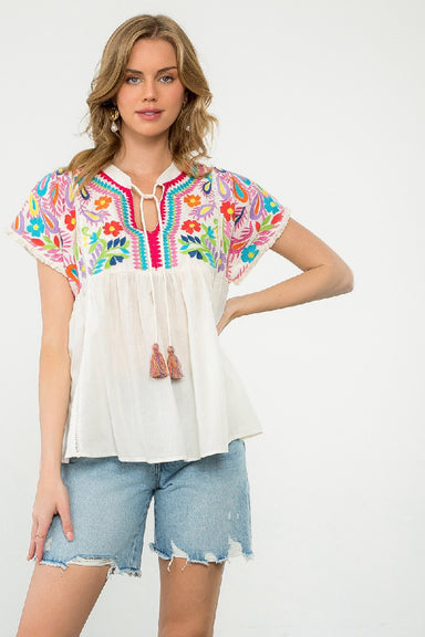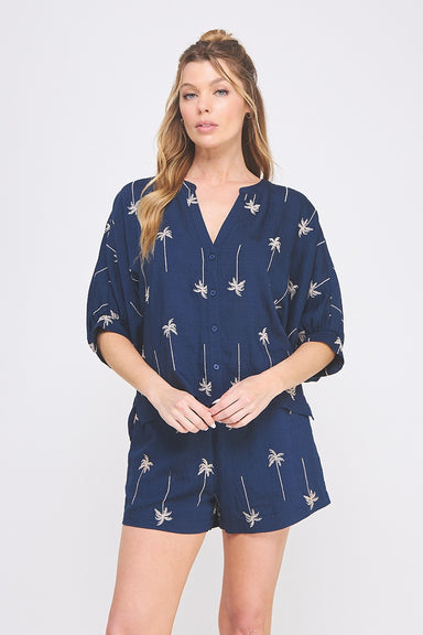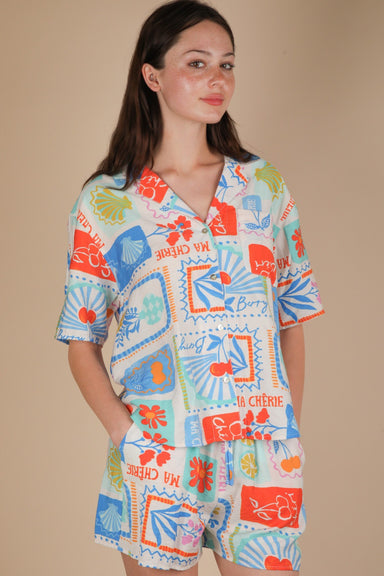 Bring the fun! The Carrie Top is a beach-inspired blouse featuring a bright shell pattern, and split neckline. 100% Cotton
