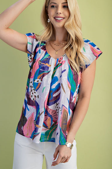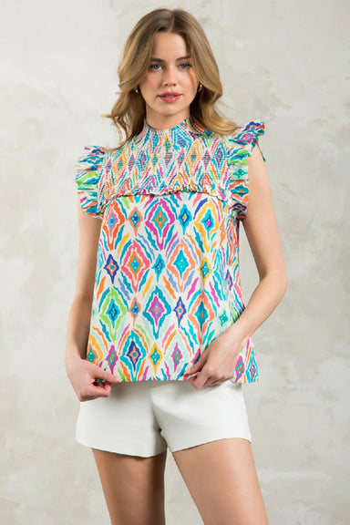 Make an entrance with this bright & fun top! It features a colorful, abstract print, smocking on chest, and ruffled sleeves. 100% Viscose