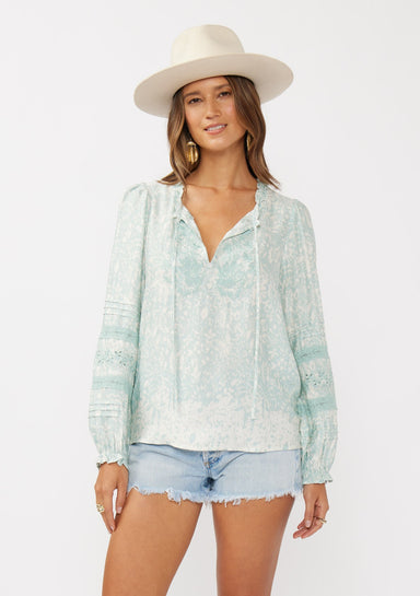 The Lanai Top is a long-sleeve blouse featuring a split neckline with a ruffle trim detail and a spaghetti tie. Made with a floral border satin cha...