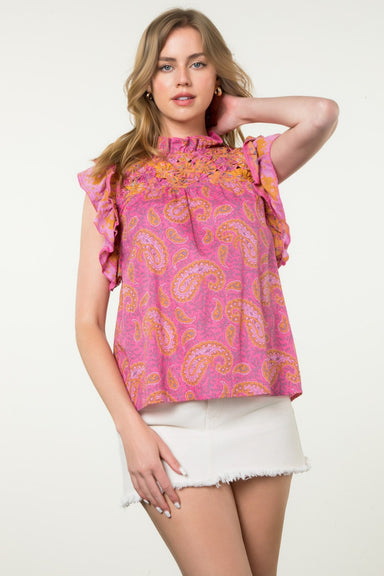 Have some fun in this paisley floral print top! The Sarah Top features a relaxed fit, flutter sleeves, and button details. 100% Rayon