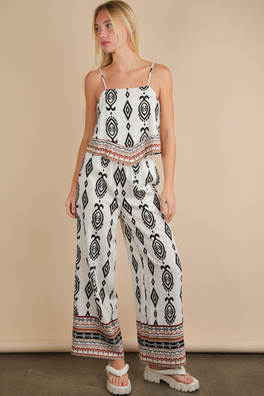 A Summer ready tank maxi dress in a beautiful bohemian abstract geometric print. Features a plunging v neckline, a waist tie, two side slits, and a...