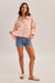The Frill Top is a classic button up shirt with a twist. It features a striped design, chest pocket, and ruffled bottom.