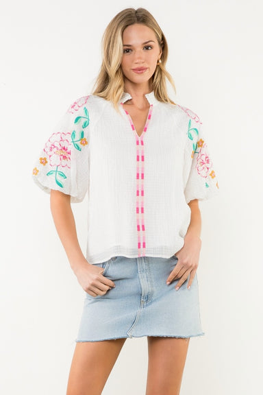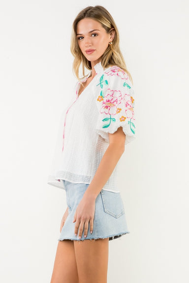 Bring the fun! The Carrie Top is a beach-inspired blouse featuring a bright shell pattern, and split neckline. 100% Cotton