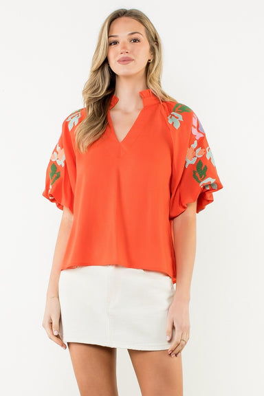 The Edge Stitch Top features a striped pattern, flutter sleeves, a ruffled v-neck, and contrast stitching detail. 55% Cotton 45% Linen